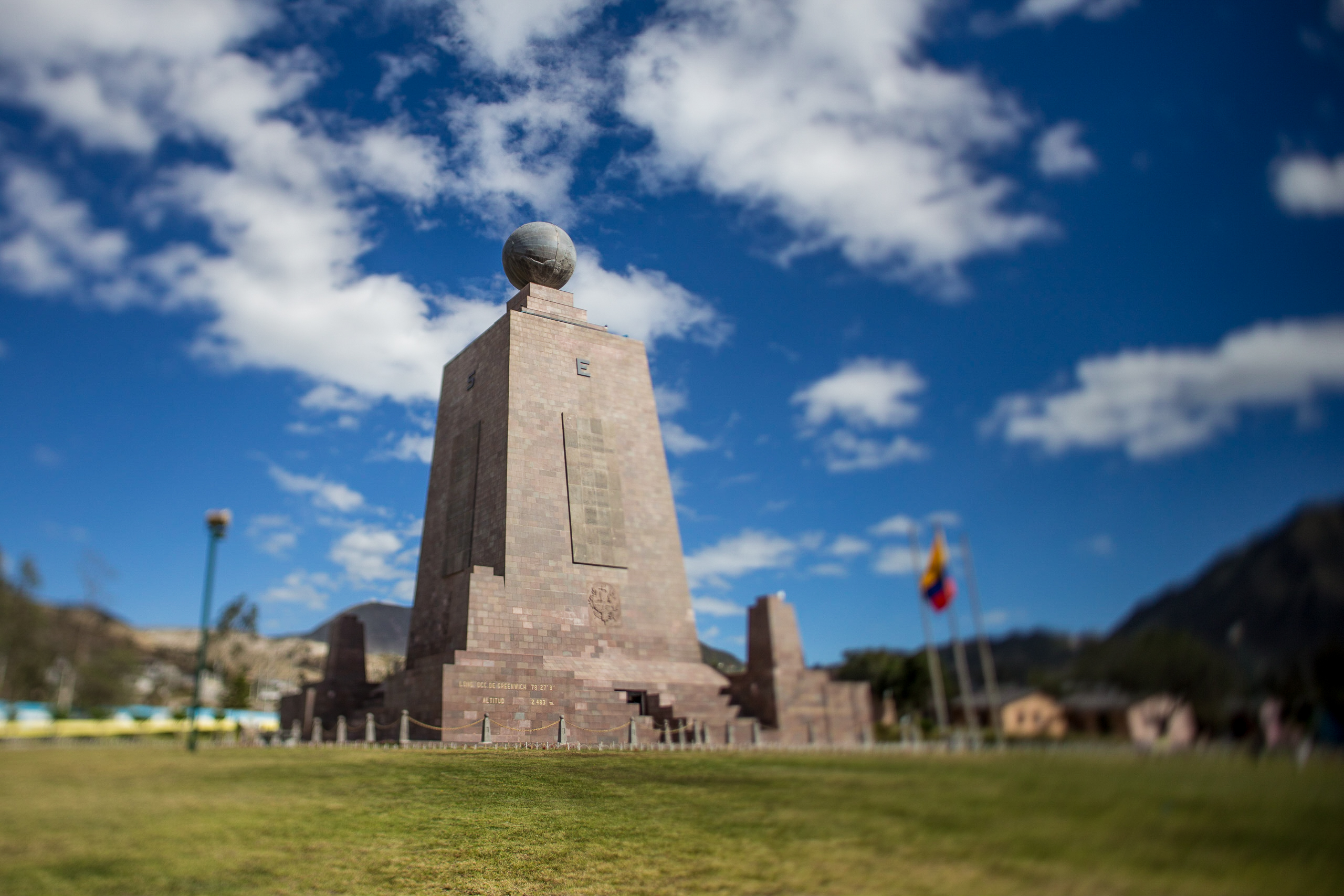 A monument at the Equator in Quito Ecuador marking what was thought to be the exact point of the equator until the advent of GPS technology, which places the actual equator in the hills behind the monument.